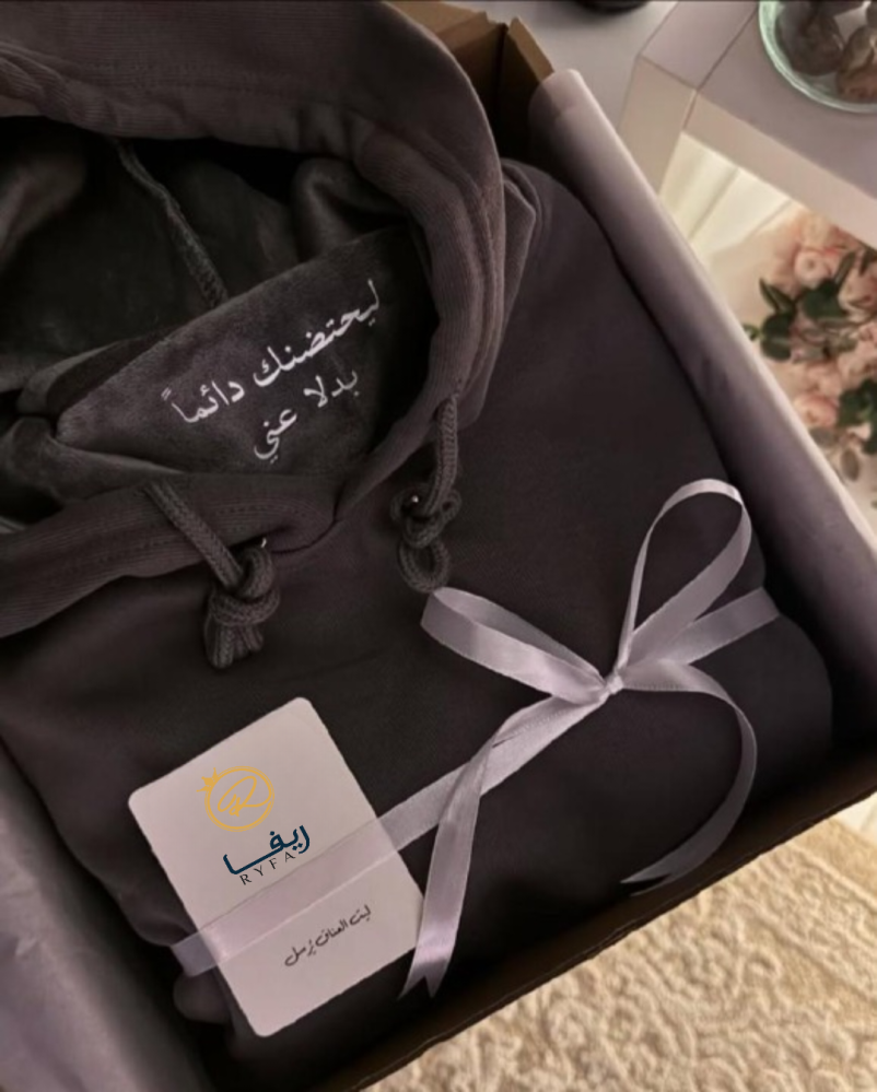 خلّك دايم دافي وأنيق مع هودي “ليحتضنك دائمًا”. الهودي هذا مصنوع من أفخم الخامات، وفيه رسالة من داخل تقول: “ليحتضنك دائمًا بدل عني”، كأنك تاخذ حضن دافي معك وين ما تروح. تقدر تختار اللون اللي يعجبك من الرمادي، الأسود، الأبيض، والكحلي. ومو بس كذا، تقدر تضيف تغليف خاص مع كرت برسالة منك أو حتى تغير الرسالة اللي جوّا الهودي حسب طلبك، عشان يكون الهدية المثالية لأي شخص غالي عليك.”