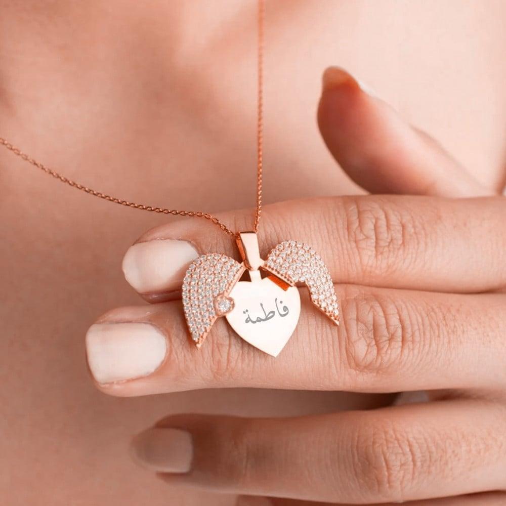 بتناسق ملفت وبديع يسبي العيون، تم صياغة هذه القطعة الفريدة من أجود أنواع الفضة النقية لتليق بحضورها البهيج وبجناحين في وسطهما قلب يمكن فتحها وإقفالها لتحتضن بداخلها اسم الشخص الأغلى على قلبك.. لتعبر عن الامتنان العميق لها