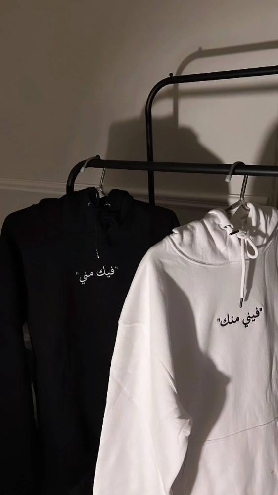يمكنك اختيار النص الجاهز "فيني منك" أو "فيك مني" ليعبر عن علاقتك الخاصة، أو كتابة نص مخصص يعبر عن مشاعرك بأسلوبك الخاص. بالإضافة إلى ذلك، أضف لمسة فاخرة برسالة جانبية مخصصة على الكمّ لتجعل الهودي أكثر تميزًا وتفردًا.